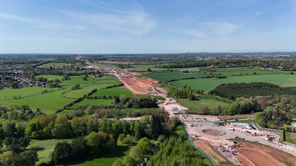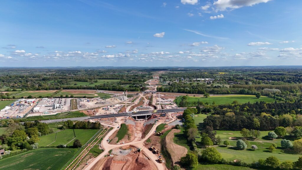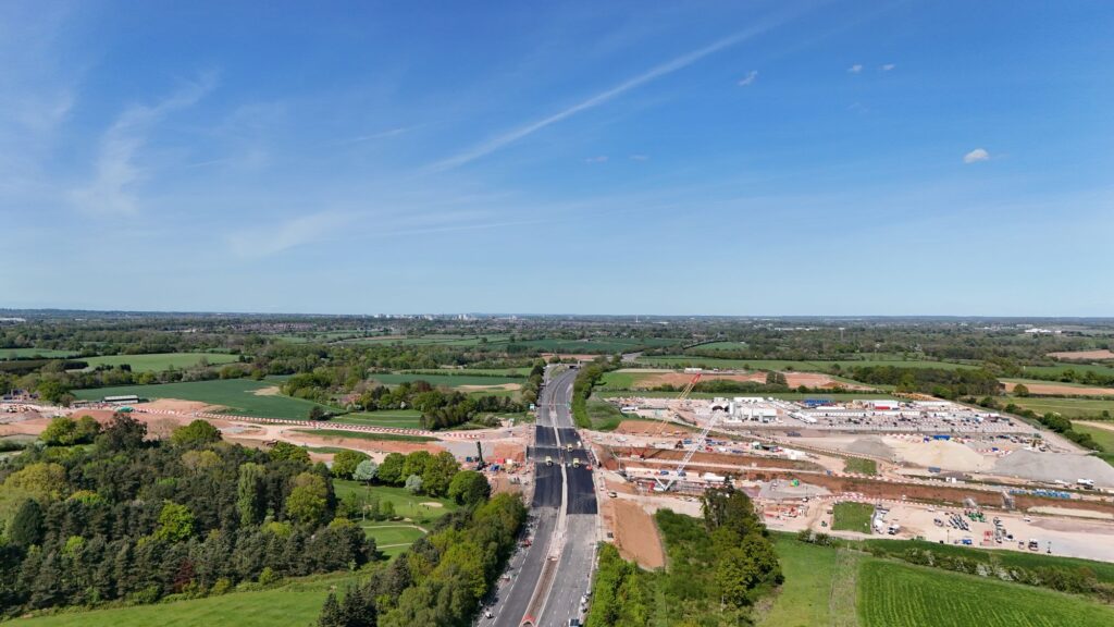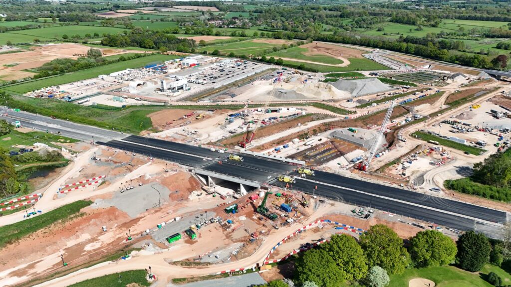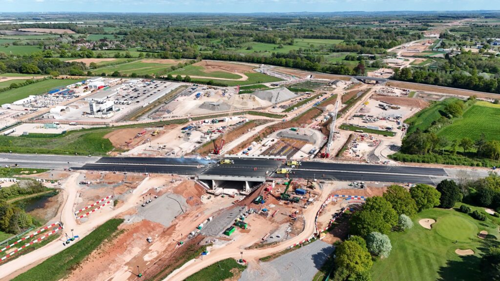 Some photo’s from a trip to Kenilworth to see the installation of a box girder bridge to carry the HS2 line under the A46 bypass. The structure was created off-site and pushed into place on-site. The preparation for this work took under a year with 19 days used to push the box into place, minimising delays for road users. Top planning from the people at HS2 to do this.