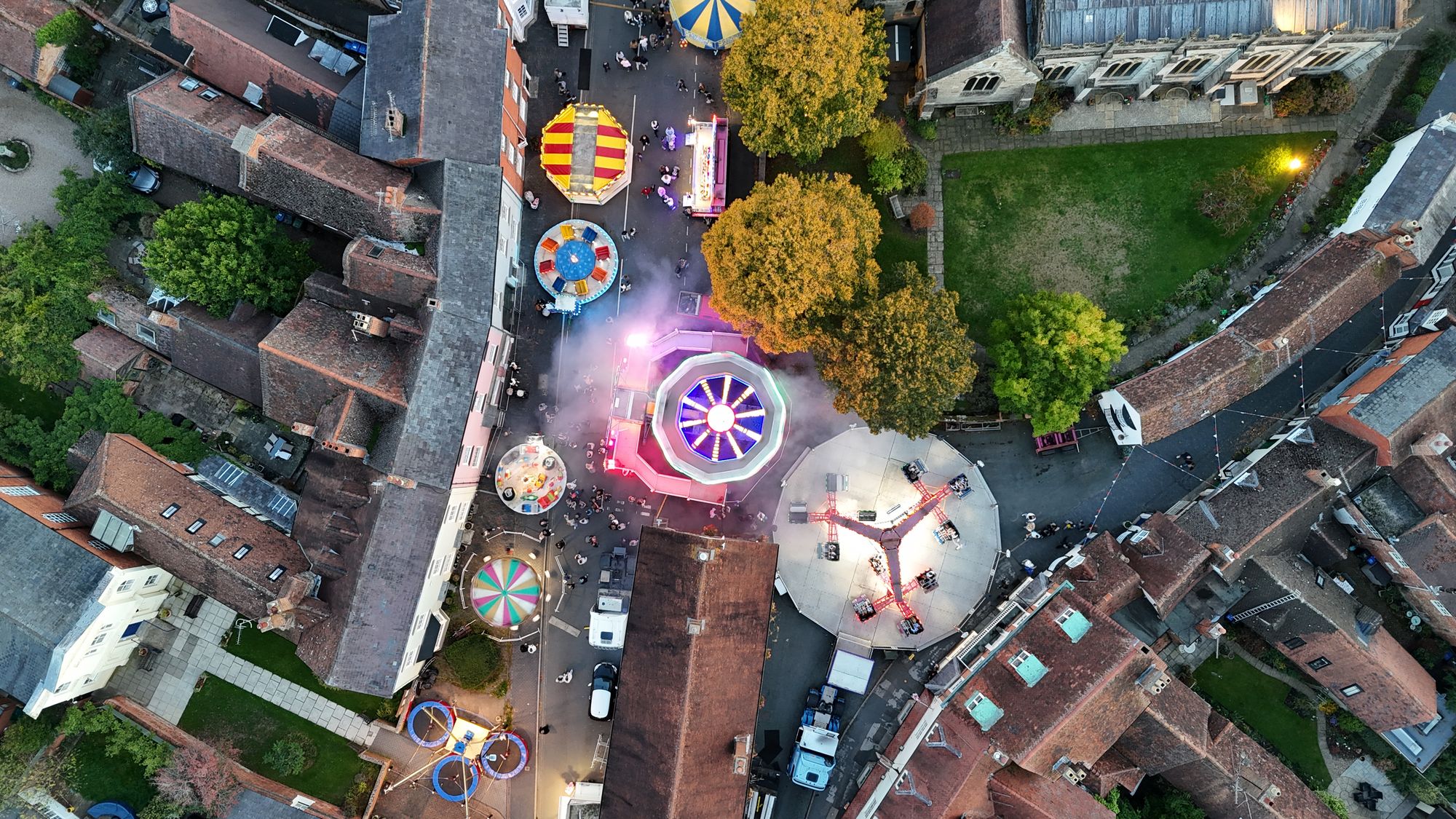 A selection of aerial pictures of Alcester’s Mop fair taken on Monday the 6th of October 2025.